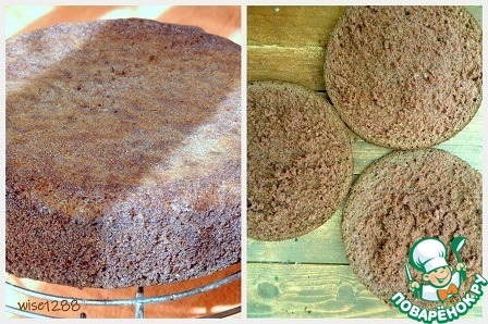 Выпекать при температуре 180 градусов 25-30 минут. Готовность проверить деревянной шпажкой. Остудить на решетке. Корж разрезать вдоль на 3 части.