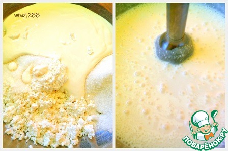 Творог соединить со сметаной и сахаром и взбить погружным блендером до однородной консистенции.