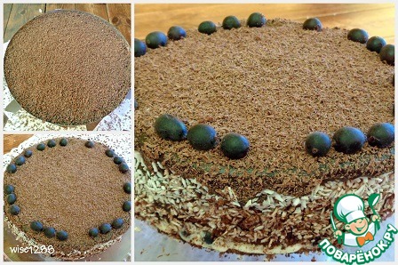 Оформить натертым шоколадом и ягодами черной смородины, на боковую поверхность торта нанести кокосовую стружку.