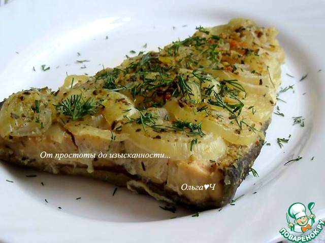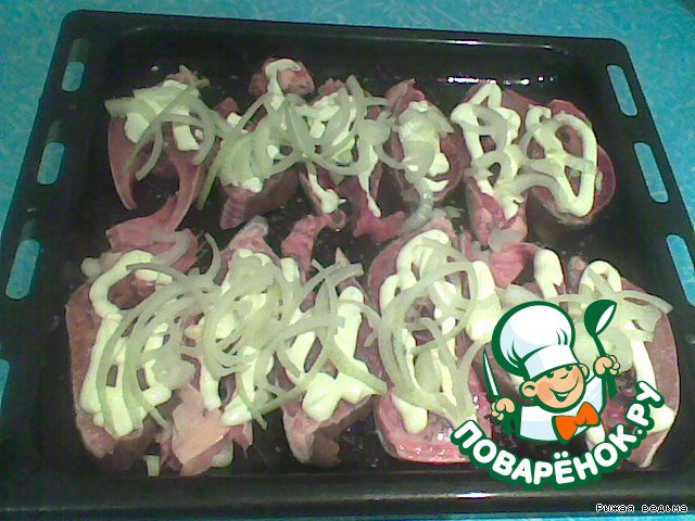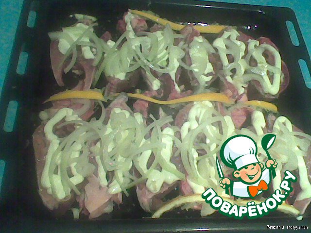 5. Заливаем майонезом, сверху кладем нарезанный полукольцами лук.