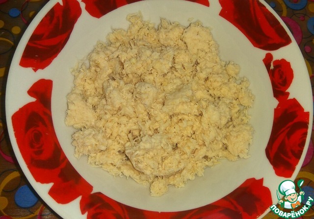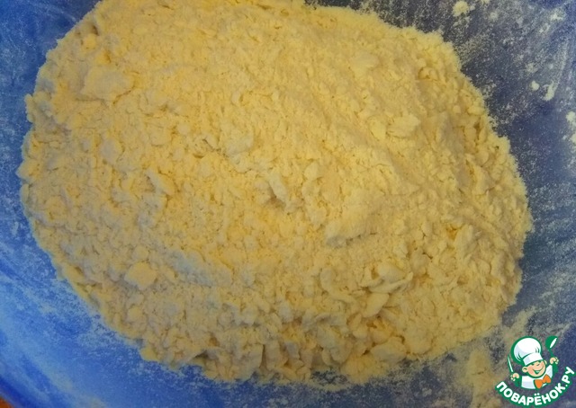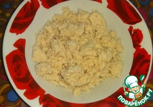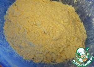 Добавить нарезанное кусочками холодное сливочное масло. Перетереть руками в крошку. -