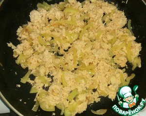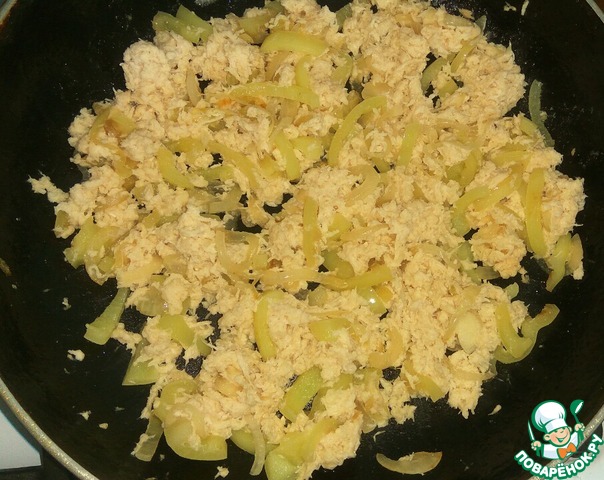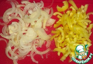 На растительном масле обжарить до прозрачности лук, добавить перец. Жарить 4-5 минут.
