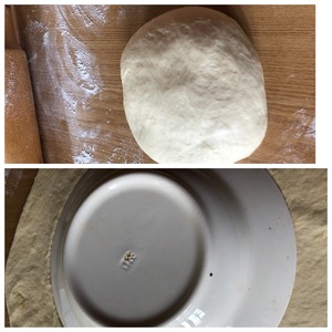 Оторвать от теста небольшой клубок и раскатать толщиной 0,5 см в круг. Можно обрезать края по тарелочке, чтобы было ровно.