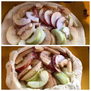 Яблоки от кожицы не очищать, только удалить сердцевинку и хвостик. Нарезать тонкими слайсами. Выложить яблоки на раскатанное тесто и защипнуть края галеты. Присыпать 1 ст л сахара сверху наши яблочки. На 1 галету уходит 3 небольших яблока. Борта галеты можно смазать молоком. Отправить галету в духовку при 200 гр до готовности.