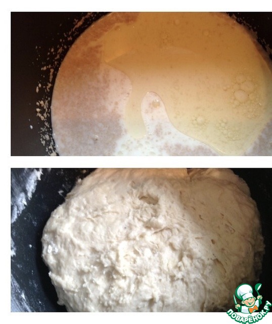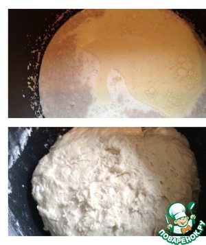 В теплое молоко добавить, соль, сахар 4 ст л, масло и дрожжи. Перемешать. Добавить муку и замесить тесто. Оставить тесто в тёплом месте до увеличения в объёме в 2 раза. Подошедшее тесто обмять. Стол подпылить мукой.