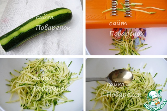 Цуккини вымыть, очистить, натереть на китайской терке.