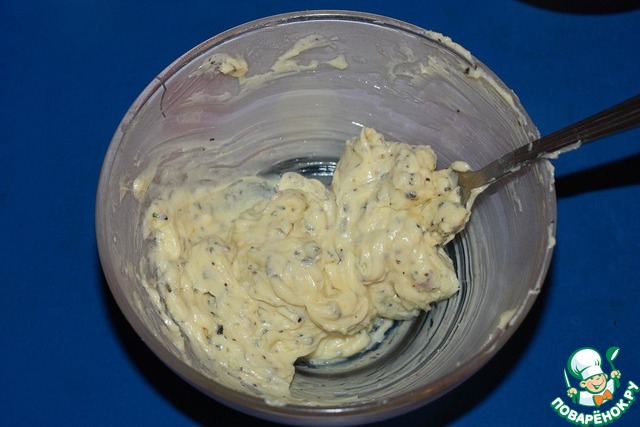 • Размягченное сливочное масло смешать с солью, перцем, пряностями, которые Вы любите к рыбе. В данном случае это сухой базилик.