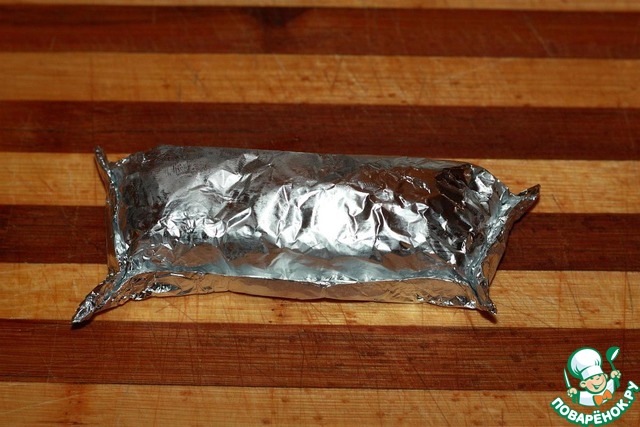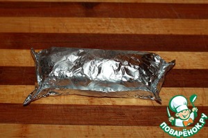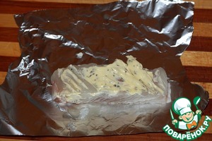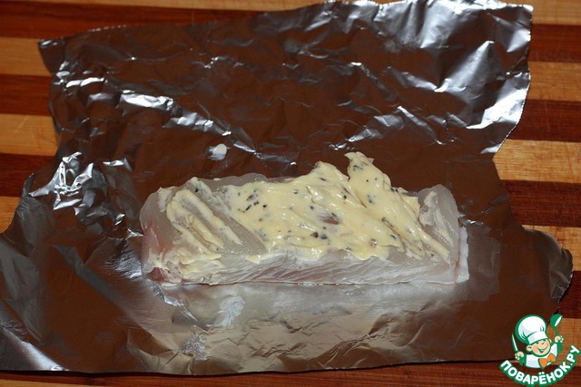 • Кусок фольги смазать оливковым маслом. Положить палтус кожей вниз и сверху намазать пряное масло.