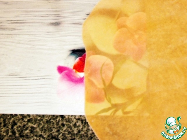 Раскатываю на подпыленном мукой столе до необходимой толщины. Линейкой не измеряю, обычно раскатываю так, чтобы через тесто хорошо просвечивался рисунок столешницы (для фото подложила салфетку).