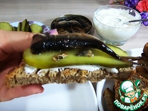 Намазываем наш готовый майонез с чесноком на обжаренный хлеб сверху кладем огурчик и сверху огурчика кладем один шпрот