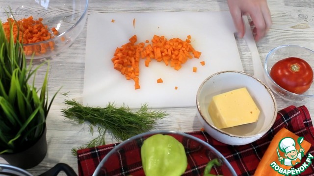Морковь нарезаем на кубики. У меня морковка попалась очень большая, поэтому я беру только половину. Добавляем в миску.