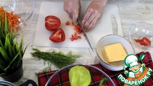 Далее у помидора убираем часть с семечками и нарезаем на кубики. Добавляем в миску к морковке.
