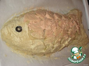 Теперь из пюре делаем каркас, прикрывая нашу начинку и формируя рыбину.