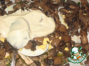 На огурцы выложить кольца яиц, на яйца обжаренные грибы.