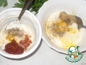Второй – смешать вторую половину сметаны и горчицу, посолить и поперчить, добавить специи по желанию.