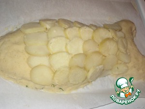 Оставленные целые картофелины очистить от шкурки и нарезать тонкими колечками, это будешь чешуя.