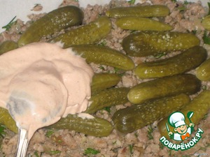 на фарш выложить маринованные огурчики, смазать красным соусом, немного соуса оставить для отделки верха.