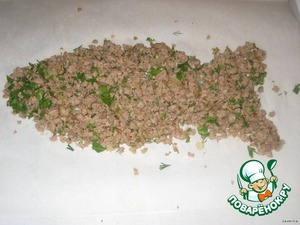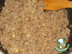 Фарш обжарить с луком, посолить, поперчить, добавить выдавленный чеснок и свежую рубленую зелень.