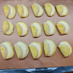 Положить сочники на лист, застеленный бумагой. Сверху смазать оставшимся желтком с небольшим добавлением молока.