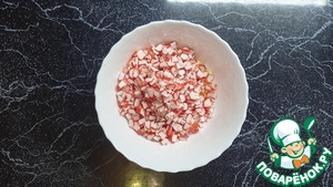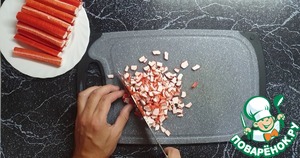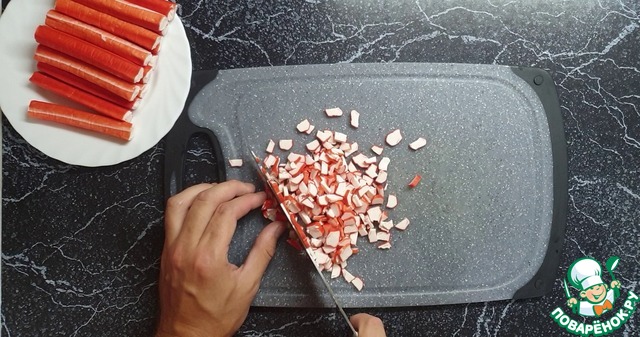 Берем крабовые палочки и нарезаем на небольшие кусочки