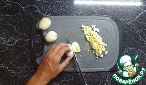 Далее, отвариваем яйца вкрутую и также нарезаем на небольшие кусочки.