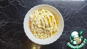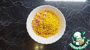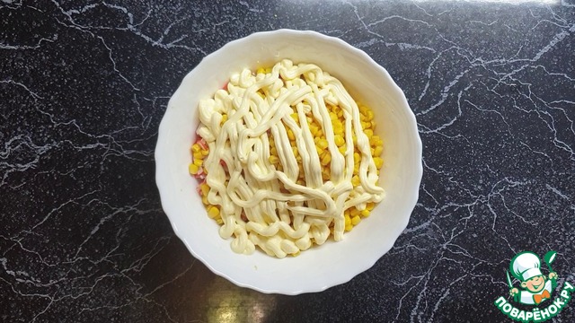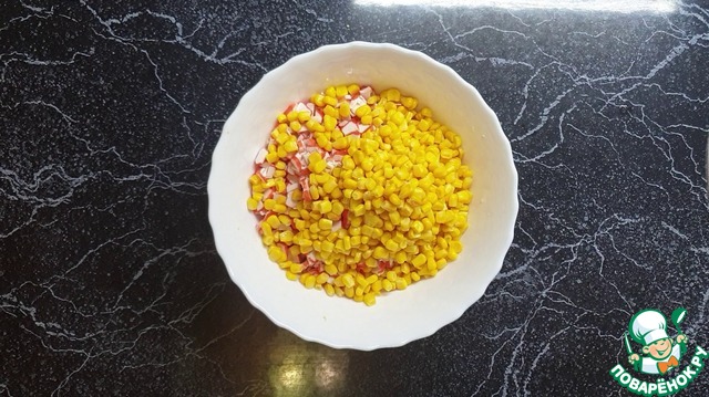Сверху высыпаем консервированную кукурузу (Без жидкости!) и солим по вкусу