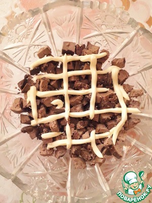 Остывшую печень нарезаем небольшими кусочками. Складываем в салатник первым слоем. Сверху смазываем майонезом. Чтоб лучше пропиталось, разровнять майонез вилкой. -