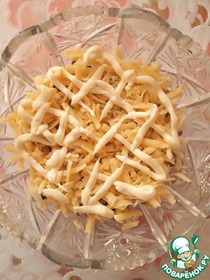 Сыр натираем на крупной терке, либо нарезаем брусочками. Выкладываем вторым слоем, смазываем майонезом.