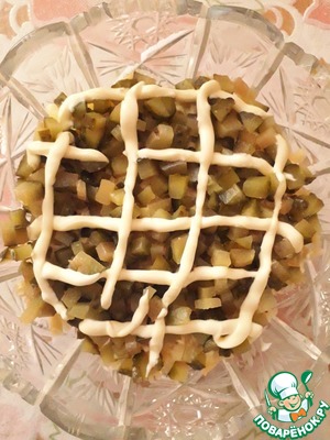 Нарезаем мелким кубиком огурчики. Выкладываем третьим слоем, так же смазываем майонезом.