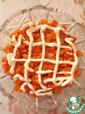 Отвариваем морковь, нарезаем кубиками, выкладываем четвёртым слоем. Если нужно, можно присолить. Смазываем майонезом.