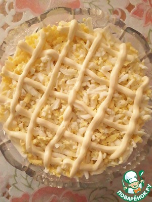 Отварные яйца натираем на крупной терке или крошим мелким кубиком, выкладываем последний слой и делаем сеточку из майонеза, либо просто смазываем.