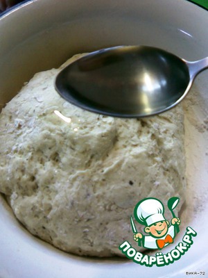 Когда тесто подойдет, добавить 3 ст. л. растительного масла и хорошо вымесить