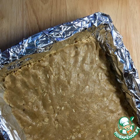 Форму для запекания застелить фольгой. Взять тесто и распределить руками по дну формы. Оставить примерно сто грамм теста для начинки. Форму поставить в разогретую духовку 190 С на 10 минут.