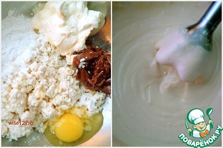Приготовить начинку: в чашке соединить творог, вареную сгущенку, крахмал, яйцо, сметану, ванилин и перебить погружным блендером. Должна получиться однородная, шелковистая структура.