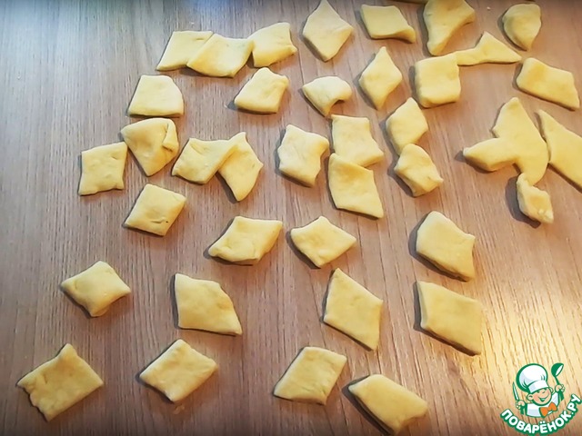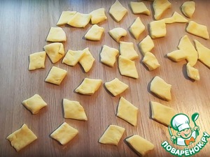 После того как тесто подошло, раскатываем его и нарезаем небольшими треугольниками