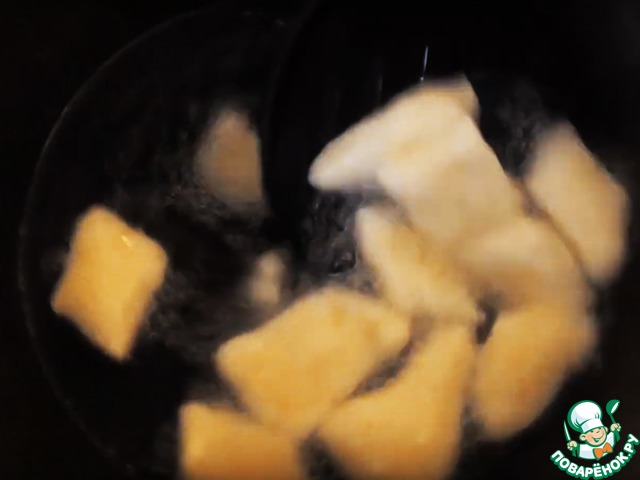 Далее берем казан наливаем растительное масло и раскаляем его после начинаем обжаривать наше тесто помешивая чтоб наши баурсаки не прилипли друг к другу