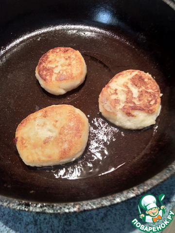На сковороду добавить растительное масло (3 ст. ложки). Сковороду разогреть. обжарить сырники на среднем огне с двух сторон.