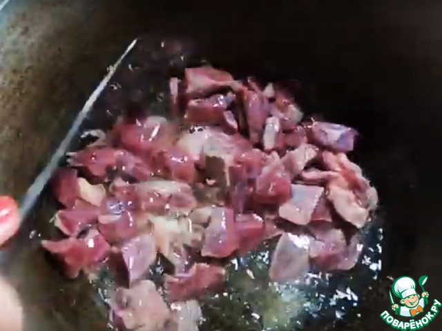 В казан наливаем масло, затем наше мясо хорошо обжариваем