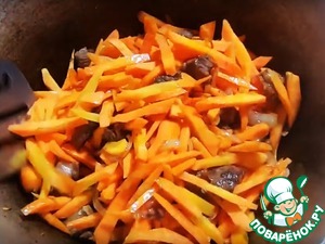 Как обжарили лук, мы добавляем морковку, ее так же хорошо обжариваем до золотистости