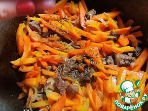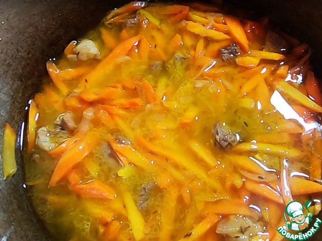 После того как обжарили моркову, мы добавляем воду и обязательно нужно учесть, что на килограмм риса, нужно 1 литр воду (если добавите больше то получиться каша) в крайней мере если не будет хватать, воду можно будет чуть чуть подлить