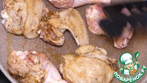 Раскаленную сковороду смазываем оливковым маслом и выкладываем курицу.
