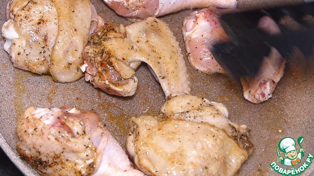 Через 15 минут переворачиваем каждый кусочек, накрываем крышкой и тушим еще 15 минут до готовности курицы. -