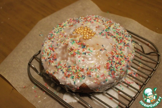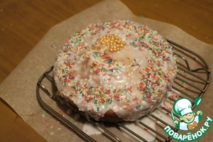 Приготовить глазурь по инструкции на упаковке. Заглазировать кекс, украсить кондитерской посыпкой.