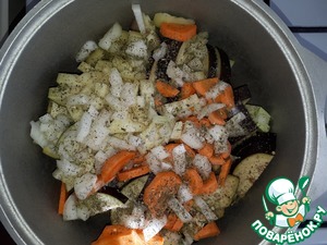 Добавить нарезанный лук белый к овощам, посолить, поперчить, добавить пряности и казанок закрыв крышкой поставить на медленный огонь. Во время приготовления необходимо помешивать. Тушить 30 мин.