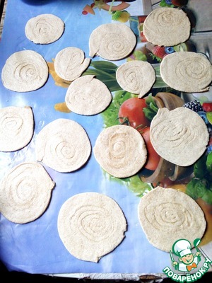Каждый кусочек приплюснуть рукой и раскатать в тонкую лепешку, как можно тоньше. -