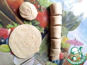 Сворачиваем в плотный рулеты, нарезаем на кусочки, шириной 3-4 см.