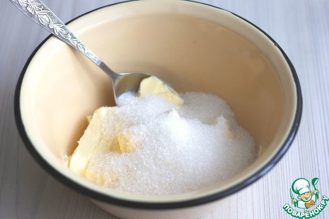 В миску добавить мягкое масло комнатной температуры (180 гр.). Добавить сахар. Растереть масло и сахар до бела.