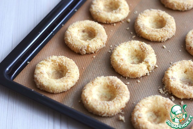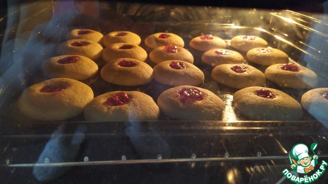 На противень, застланный пекарской бумагой поместить печенье. В каждом сделать углубление при помощи пестика. Отправить противень в разогретый до t180-190С духовой шкаф.