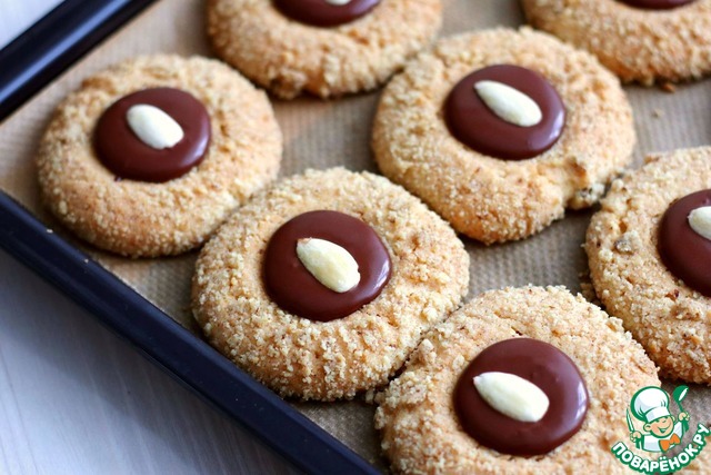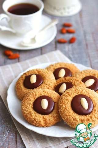 Шоколад (100 гр.) расплавить на водяной бане, добавить постепенно в горячий шоколад сливки (густоту отрегулировать по своему вкусу). В готовое печенье добавить по 1 чайной ложке шоколадно- сливочной смеси, в середину добавить очищенный миндаль.