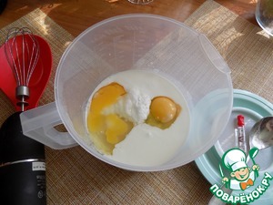 Для приготовления теста для кексов я буду использовать электро-венчик. Наливаем в посуду кефир, разбиваем яйца, выкладываем сахар и разрыхлитель. Соединяем.